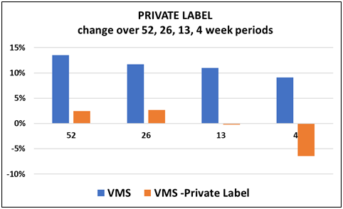 Consumer behaviors are changing rapidly as reflected in the weak financial performance of major retailers like Target, Walmart, and others. The retail level sales data for VMS aligns to this with Private Label leading the pull back. As a key category within the greater health and wellness sector, VMS’s slowdown is indicative of what can be expected across the sector.This is consistent with the historical pattern of health and wellness getting weaker, but not crashing, during times of economic stress. As witnessed in the VMS numbers which continue to show strong single digit growth just not at the same robust pace of recent periods.