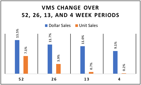 An additional level of analysis of these numbers starts to provide valuable insights regarding consumers behaviors and pricing. The spread between the growth rates in dollars versus units indicates the average selling price. The 52 week spread is 6.4%, 26 week is 7.8% and 13 week is 10.3%, which means that on average VMS prices have been dramatically increasing. This is consistent with the overall Consumer Price Index (CPI) during this same time period. Interestingly the 4-week spread is 8.9% which is a meaningful drop from 10.3% over the 13 weeks. Retail sales numbers over 4 week periods are notoriously volatile due to promotions, inventory timing and other short term impacts, but in this case the 4 week numbers is potentially a leading indicator ofprice action.