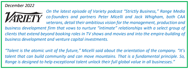 The agencies’ foray into business development serves an important and much needed role. Similar to a private equity fund, the talent agent’s “gatekeeper” role will help ensure an authentic alignment of talent with business opportunities. More than just about any other constituent, agents have a strong incentive to protect the reputation of their clients and the companies they are associated with.