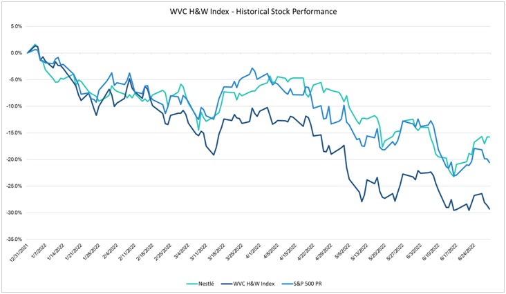 The largest company in the WVC H&W Index, Nestle, is an interesting case study as well as a bellwether food company. In the last many years Nestle has invested heavily in supplements and healthier offerings, including purchasingVital Proteins, The Bountiful Company, Atrium, Persona and Nuun as it works to reinvent itself and align to the global health and wellness trend. It can be argued that the company represents both the old-line legacy “big food” model as well as the more nimble disruptive innovators. The performance of the stock over the last six months reflects this positioning as it closely tracked the S&P 500 and split the difference between the WVC H&W Index top and bottom performers with a six month return of negative 15.8%.It will be interesting to see how this stock performs over the rest of this year and what M&A opportunities could arise.